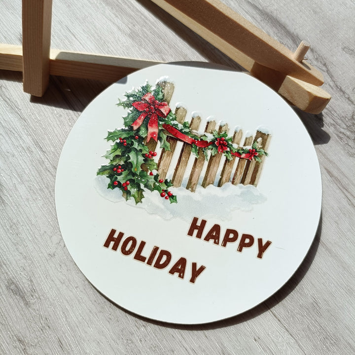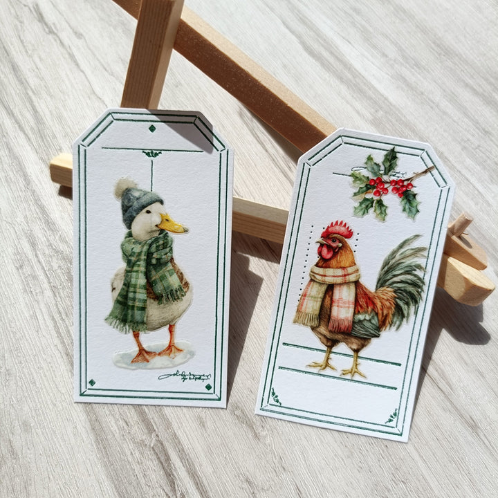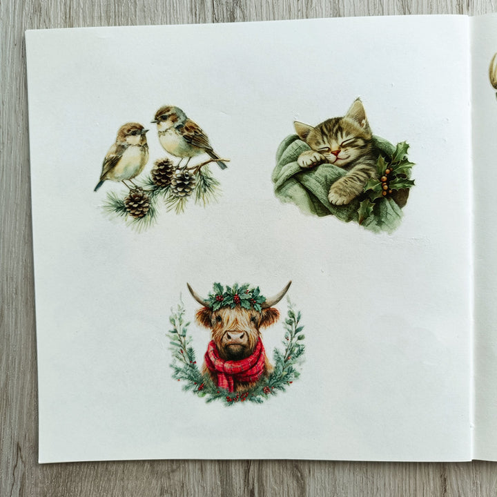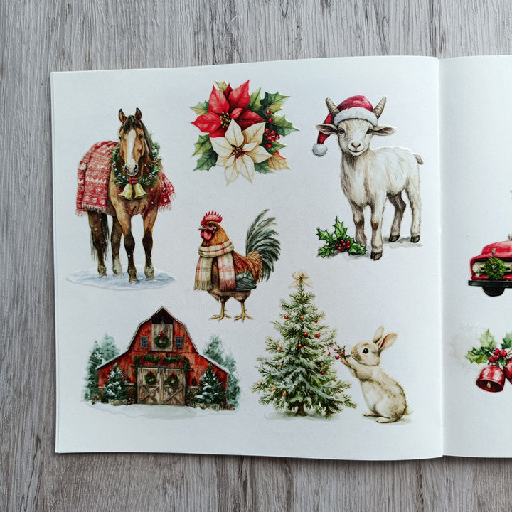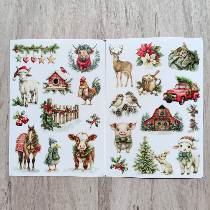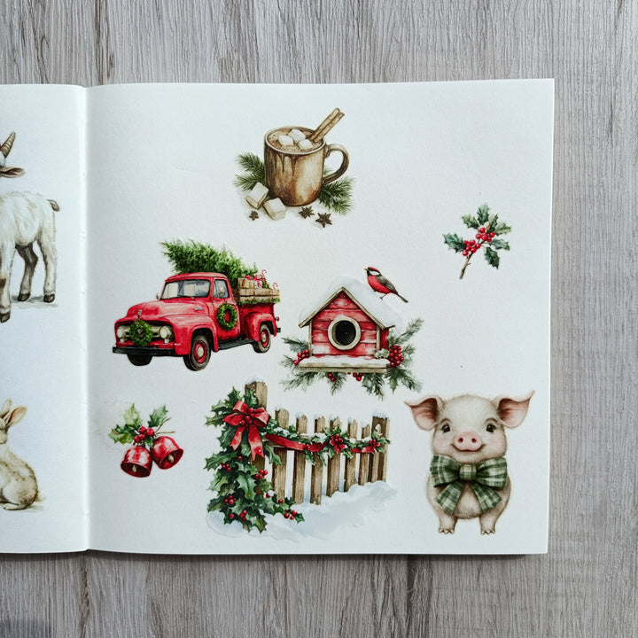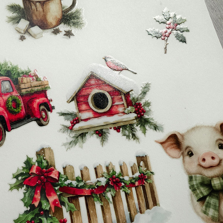 Christmas Farm Matte Transfer Stickers can be used on paper surfaces like journals, notebooks, scrapbooks, and cardstock — and on hard, flat surfaces such as wood ornaments, glass, plastic boxes, or ceramic jars.